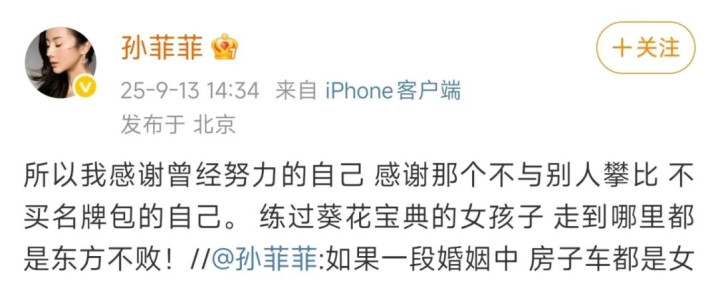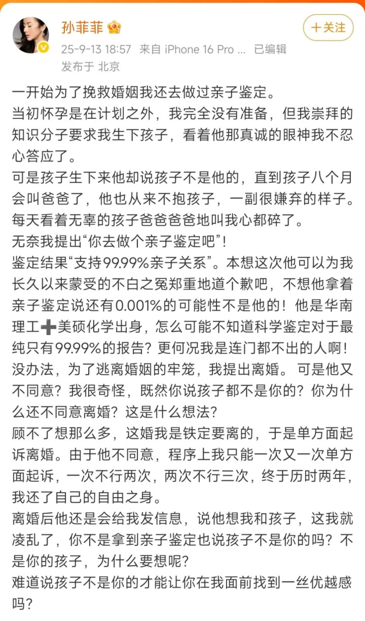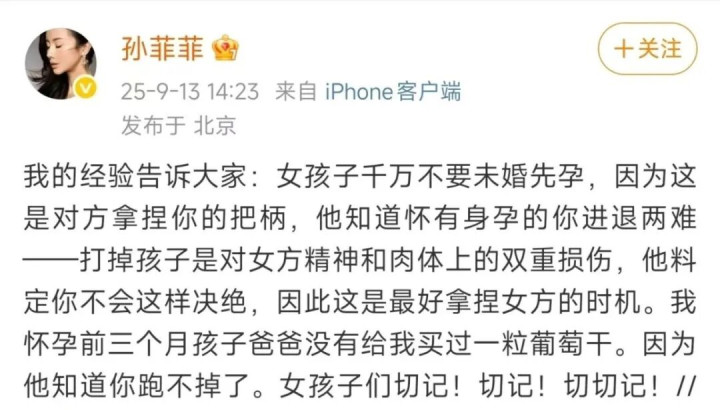 9月13日,近年来持续爆料“娱乐圈乱象”的著名女演员孙菲菲,在社交账号官宣离婚。她连发9条微博,解释自己为何要离婚,并分享自己的经验之谈:女孩子千万不要未婚先孕。