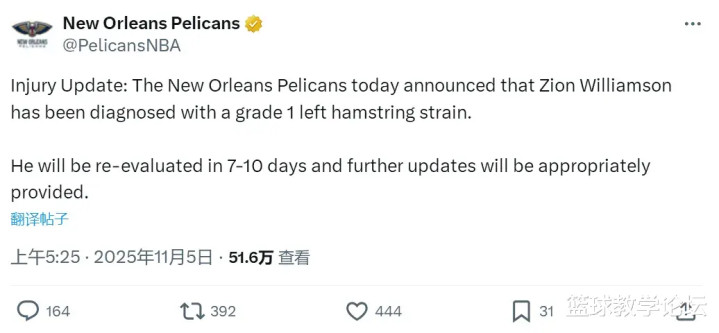 腿筋拉伤对锡安来说算是旧伤复发,几乎每年都要来一次:2023年1月、2024年4月和2024年11月,他至少三次遭遇腿筋拉伤。而且左腿筋和右腿筋都伤过,两条腿全废了。随着锡安伤停,鹈鹕会不会俯冲明年的状元签?想多了!