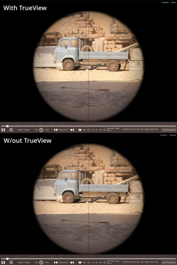 -TrueView无法精确还原渲染帧的时序,因此原始玩家体验与回放之间仍存在差异,尤其在极慢速回放时更为显著。 点击鼠标用于判定玩家的帧位,将精确显示至最近的demo回放帧。但由于CPU与GPU的流水线工作机制,游戏运行时的后坐力、枪口火焰、血迹喷溅和布娃娃系统等反应特效在游戏过程中会延迟1-2帧,因此在demo回放中这些效果不会同步出现。