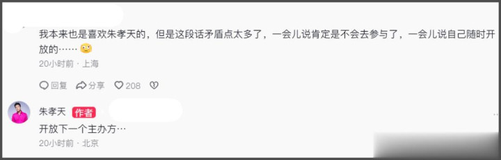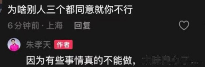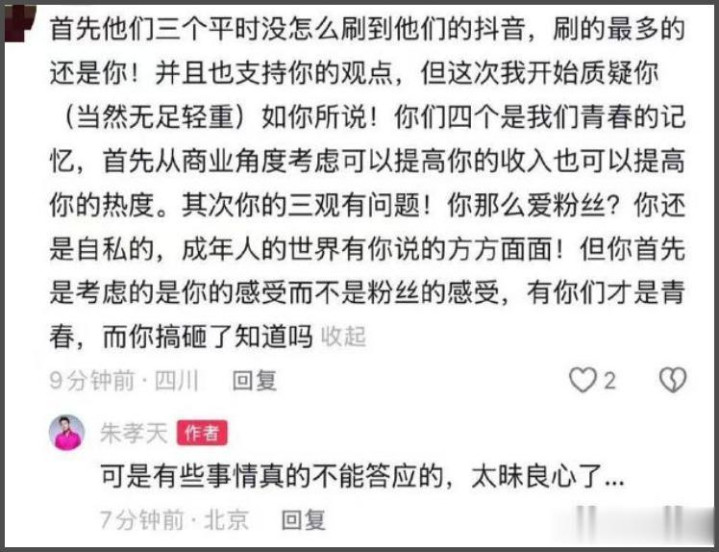 还有网友质问,为什么其他三个人都能答应,就他不行?朱孝天依旧回应称“因为有些事情真的不能做,太昧良心”,就差把和3观念不合摆在明面上了,还阴阳其他三人“昧良心”。