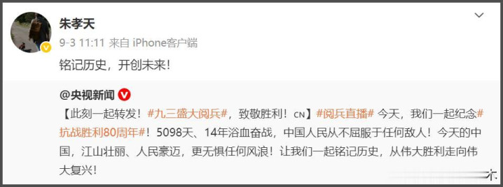 8月份的时候,F4还在五月天鸟巢演唱会上合体表演过,随后就有要办合体演唱会的消息,但这四个人当中,只有朱孝天转发了九三阅兵的相关博文,言承旭和吴建豪都没有转发,周渝民则是从2018年就断更了。