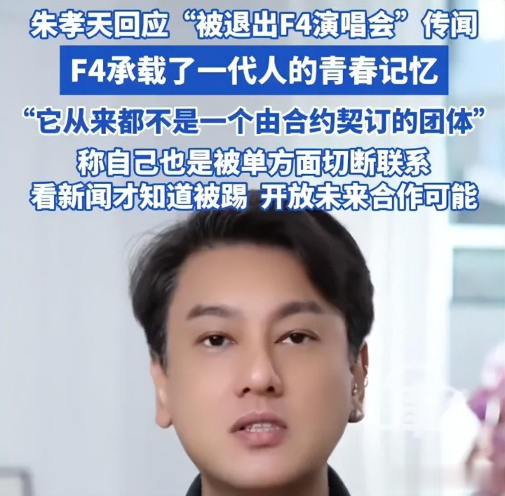 朱孝天缺席F4演唱会一事闹得沸沸扬扬,他自曝因为拒绝相信音乐的要求而被踢出局,还爆料相信音乐的要求太没良心,就算以后F4再合体,也不会和相信音乐合作,还疑似和其他三人观念不和。