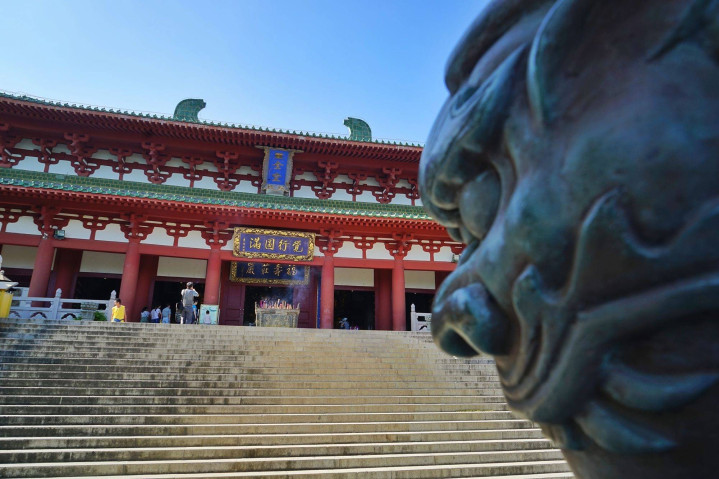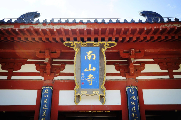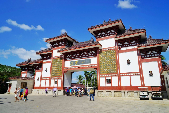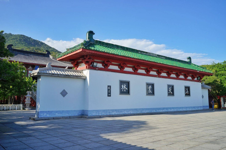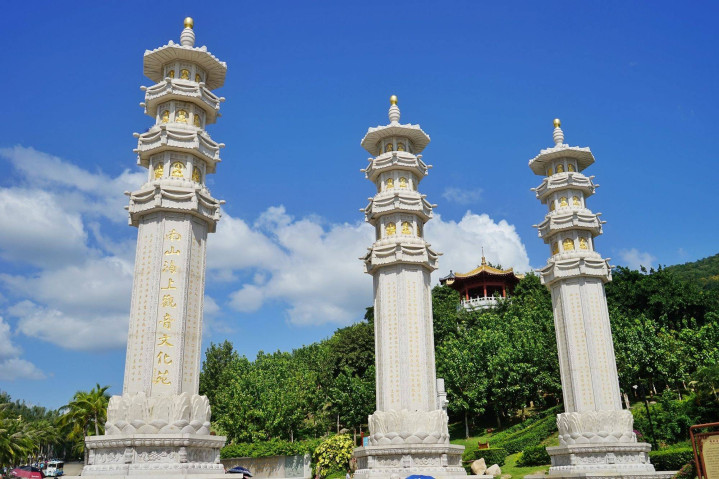 南山寺是我国最南端的寺庙,占地面积极大,匾额由原中国佛教协会会长赵朴初亲自题写。整个寺庙为仿唐建筑风格,白墙红柱,规模宏大,带着极强的盛唐气象。