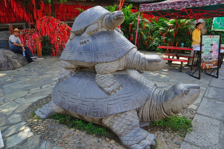 门口牌坊两侧是“福如东海长流水 寿比南山不老松”的楹联,谷内也尽是乌龟雕像、石刻等福寿文化元素,一趟走下来感觉沾了许多灵气和喜气。