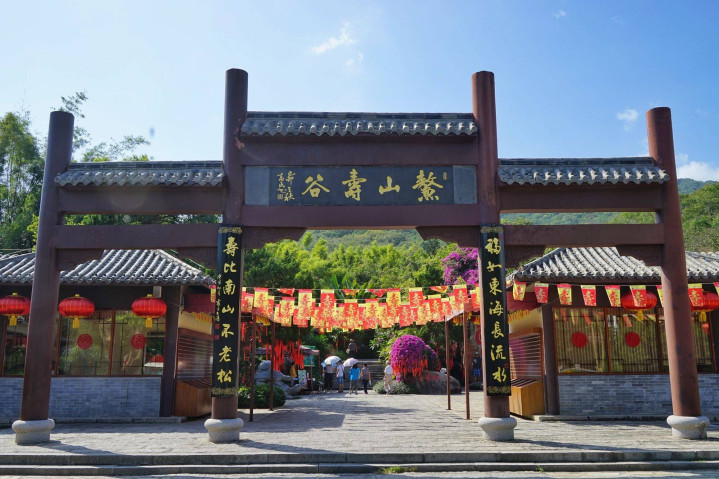 鳌山寿谷也叫长寿谷,其名字来源于一个传说,据说观音的坐骑神鳌走到南海之滨时,发现这里人杰地灵,生活在其中的人都健健康康,长命百岁,于是巨鳖便在此停下脚步,伏卧福地,形成南山,南山因此也叫做鳌山。