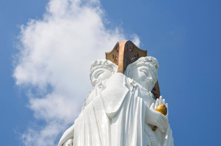 观音像三体合一,北面手持净水瓶,西南面手持长串佛珠,东南面手持莲花。站在观音脚下仰望,更能感受到观音像的巍峨,他们微微低头,仿佛在静静注视着芸芸众生。