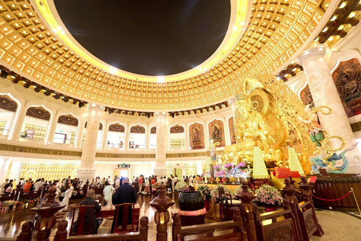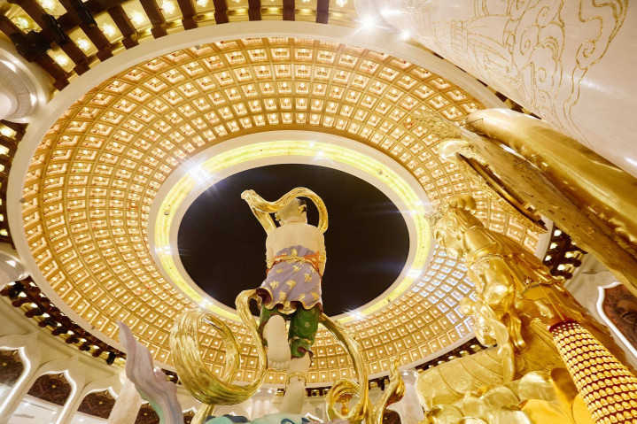圆通宝殿内金碧辉煌,处处可见大小不一,姿态各异的金色佛像,搭配穹顶的二十四诸天壁画和琉璃莲花灯,让人眼花缭乱,仿佛进入了佛国世界。