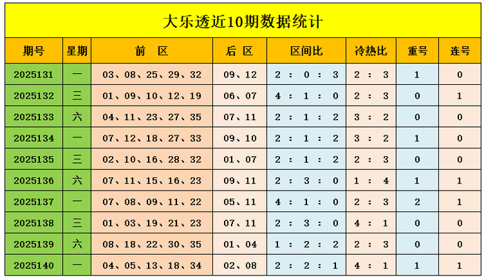 上期回顾:大乐透第2025140期奖号为:前区04、05、13、18、34,后区02、08,前区奖号三区比为2:2:1,冷热比为4:1,后区开出小大组合02、08